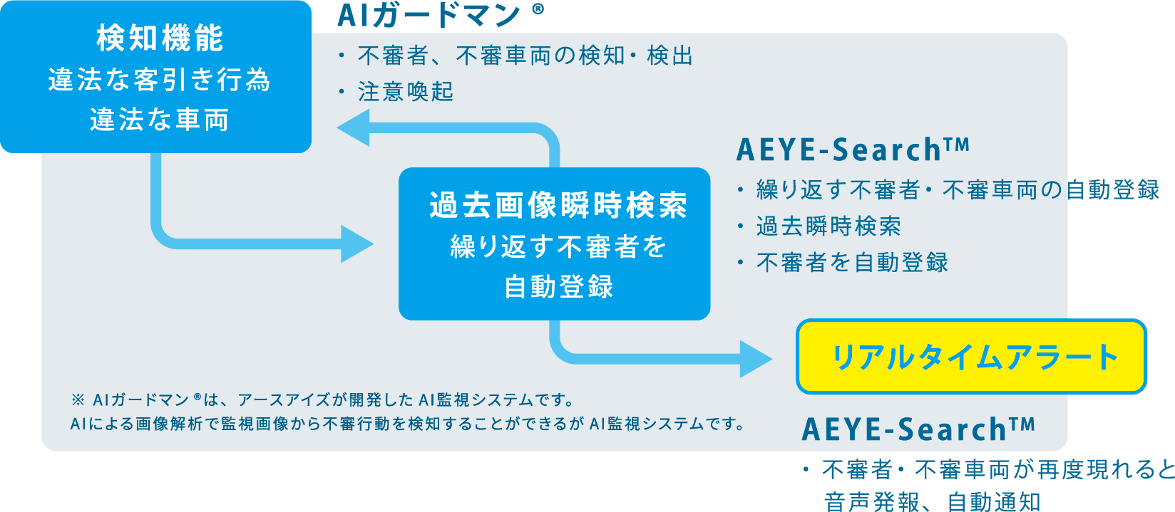 | 行動検出 | 不審行動、違法行為 |