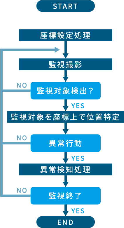 - もう一つの基礎技術である「AI画像解析による行動検知技術」は、上述の「3D空間把握技術」に、AIの画像解析機能を独自の構成で組合せることによって、監視対象人物の「特定行動」を高い精度で認識することができるようにした技術です(特許第6534499号(人の物に対する行動検知)、特許第6562437号(視線検知))。尚、この技術は、創業以来10年の歳月をかけてアースアイズが蓄積してきたAIの学習にかかる独自のノウハウによって支えられています。